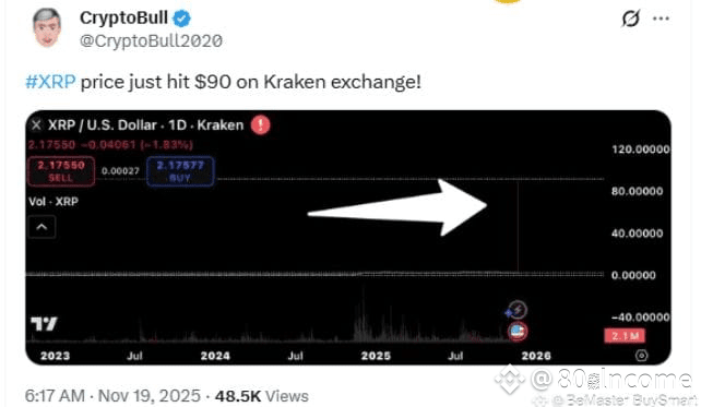 $XRP just shocked the crypto ecosystem, as CryptoBull (@CryptoBull2020) reported that the asset touched $90 on Kraken. Exchange data from Kraken shows a sharp vertical move at 05:15 UTC+1. That moment stood out because nothing in the market had hinted at such a surge.