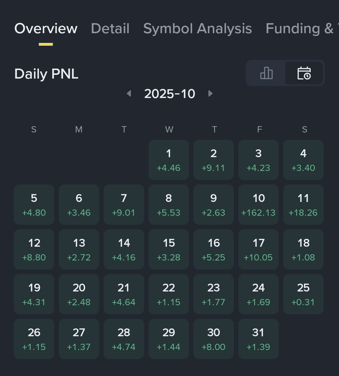 Octubre fue salvaje en los mercados. En un momento, más de $19 mil millones fueron eliminados — liquidación tras liquidación, pánico por todas partes… pero a pesar del caos, logré cerrar cada día en verde. ✔️💚