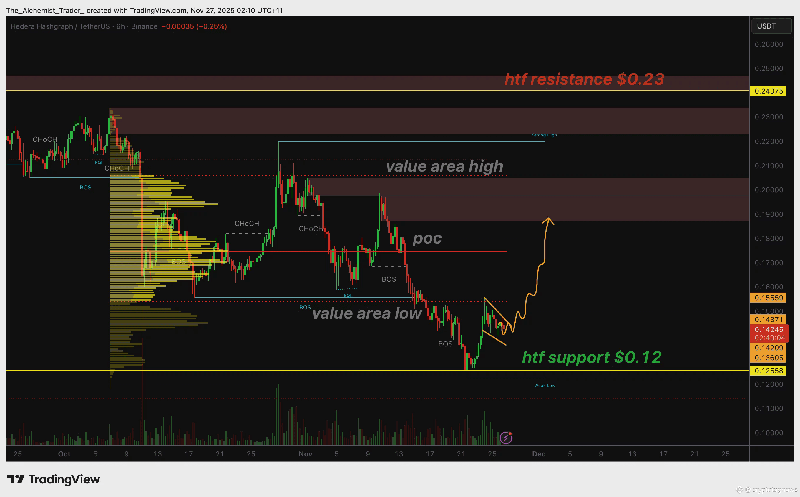 From a technical perspective, HBAR is currently at an inflection point. The bullish flag structure and renewed buying pressure suggest a reversal phase may be forming, but confirmation requires a breakout with volume and a subsequent higher high. If HBAR breaks out of the bull flag with strong volume, a rally towards the control point and ultimately resistance on the upper time frame at $0.24 becomes likely.