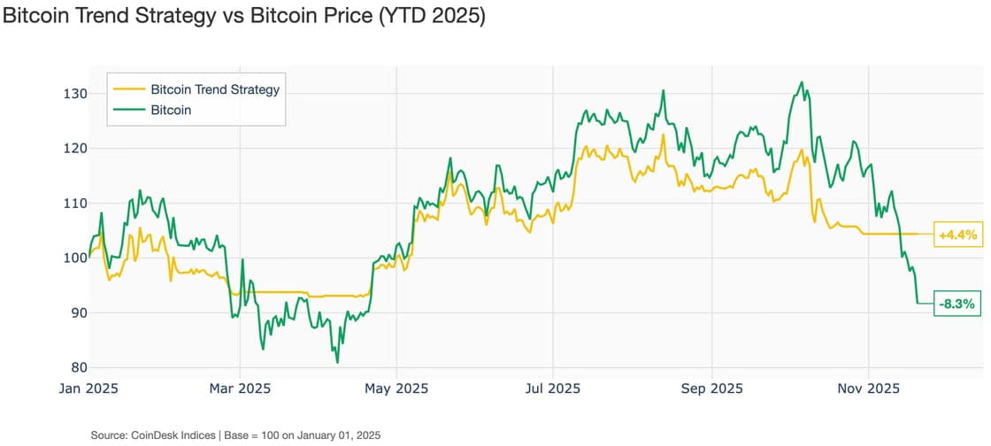Hablando de tendencia, está resultando ser un salvador del rendimiento de 2025. Nuestro Indicador de Tendencia de Bitcoin (BTI), lanzado en marzo de 2023, utiliza un cuarteto de señales de cruce de medias móviles para indicar la presencia y fuerza de la tendencia en el precio de bitcoin. Ha indicado "Tendencia a la baja significativa" durante 24 días. Nuestros clientes han implementado varias estrategias basadas en BTI para asignar a — y alejarse de — bitcoin. El rendimiento YTD de uno de esos aparece a continuación.