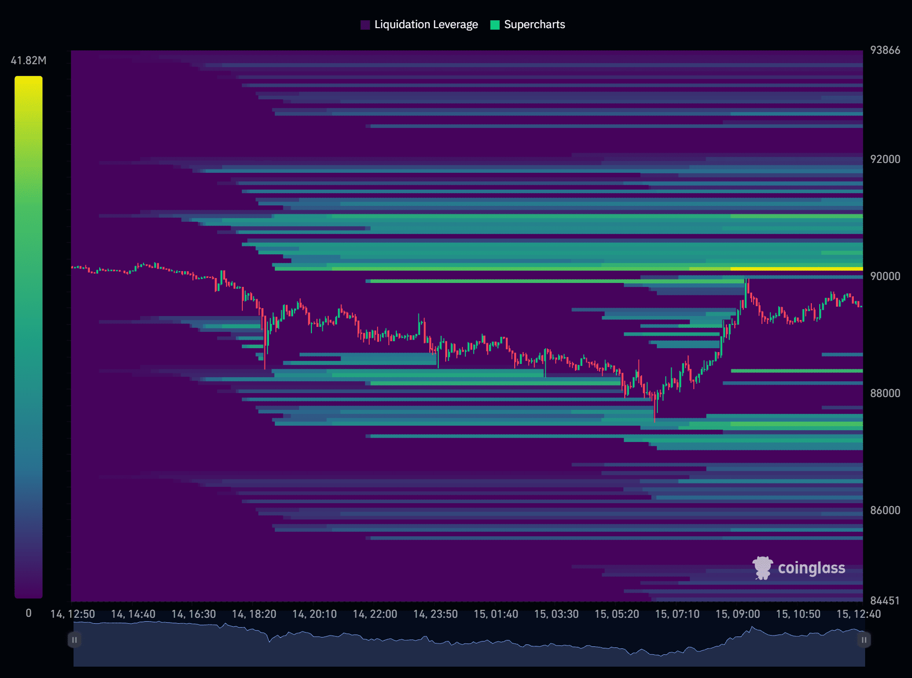 - Mapa de calor de liquidación: accede a Coinglass, las áreas amarillas son zonas de alta liquidez, donde los Retail y los tiburones, ballenas 🐳 colocan órdenes Long/Short, es aquí donde se caza el Stop Loss. Cuanto más necesite una zona el precio de mercado y más clara sea, más fácil será cazada.