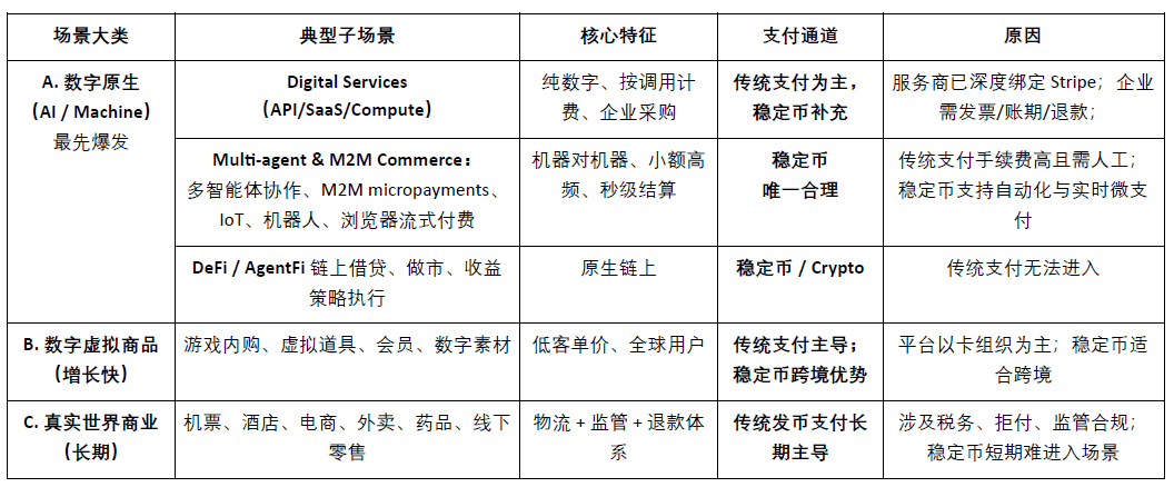 El principal obstáculo que impide que las monedas estables escalen en el comercio real no es solo la tecnología, sino también la regulación (KYC/AML, impuestos, protección al consumidor), la contabilidad comercial (pago ilegal de monedas estables) y la falta de mecanismos de resolución de disputas para pagos irreversibles. Debido a estas limitaciones estructurales, es improbable que las monedas estables entren en sectores altamente regulados como la salud, la aviación, el comercio electrónico, la administración pública y los servicios públicos a corto plazo. Su implementación se centrará principalmente en escenarios con menor presión regulatoria o aquellos nativos de la blockchain, como el contenido digital, los pagos transfronterizos, los servicios nativos de la Web3 y la economía de las máquinas (M2M/IoT/Agente). Esta es precisamente la ventana de oportunidad para que el comercio con agentes inteligentes nativos de la Web3 logre un gran avance en escala.