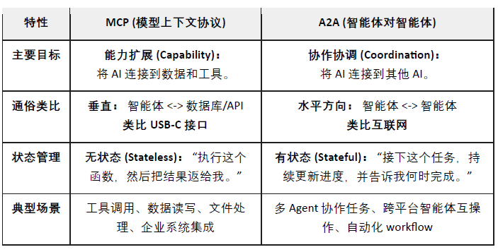 A2A aborda la cuestión de "cómo un agente puede trabajar con otros agentes": establece estándares de comunicación nativos para agentes inteligentes entre proveedores y marcos, admite diálogos de múltiples turnos, descomposición de tareas, gestión de estados y ejecución de ciclos de vida largos, y sirve como capa de interoperabilidad fundamental entre agentes inteligentes.