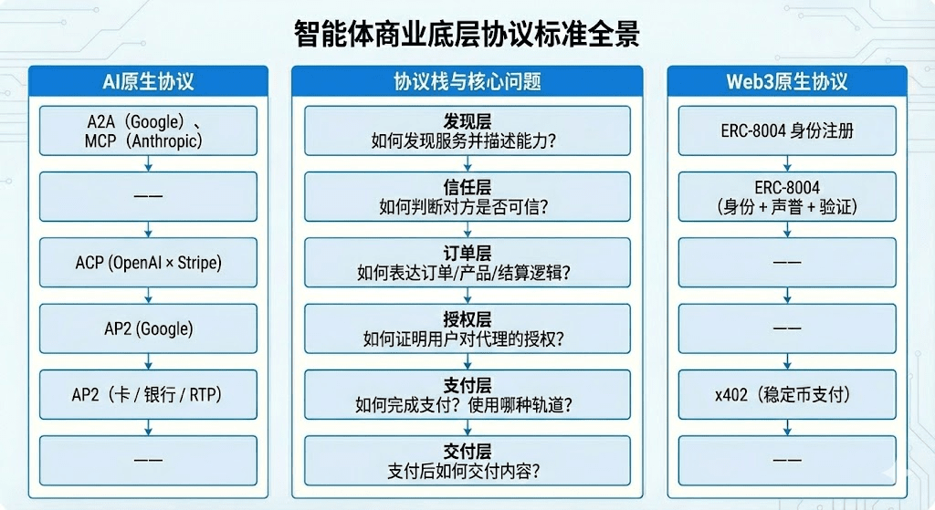 El comercio agente es el establecimiento de un orden económico completamente nuevo, dominado por máquinas. No se trata simplemente de que la IA realice pedidos automáticamente, sino de reconstruir toda una cadena interentidad: cómo se descubren los servicios, cómo se establece la confianza, cómo se expresan los pedidos, cómo se otorgan los permisos, cómo se liquida el valor y quién asume la responsabilidad de las disputas. La aparición de A2A, MCP, ACP, AP2, ERC-8004 y x402 estandariza el modelo de negocio de circuito cerrado entre máquinas.
