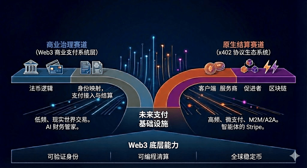 A lo largo de esta trayectoria evolutiva, la futura infraestructura de pagos se divergirá en dos vías paralelas: una basada en la lógica tradicional de las monedas fiduciarias para la gobernanza empresarial, y la otra basada en el mecanismo de liquidación nativo del protocolo x402. La lógica de captura de valor de estas dos vías difiere.