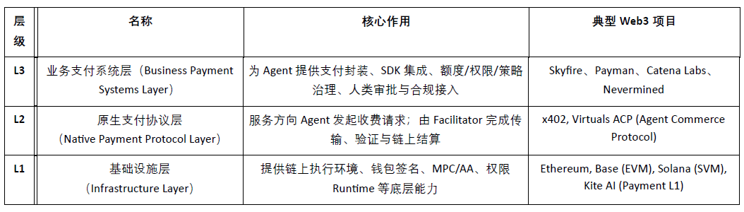 La capa del sistema de pago empresarial (L3), que incluye proyectos como Skyfire, Payman, Catena Labs y Nevermined, proporciona encapsulación de pagos, integración de SDK, límite de crédito y gobernanza de permisos, aprobación humana y acceso de cumplimiento, y se conecta a las vías financieras tradicionales (bancos, organizaciones de tarjetas, PSP, KYC/KYB) en diversos grados, construyendo un puente entre el negocio de pagos y la economía de las máquinas.