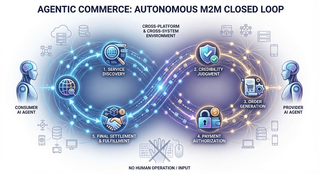 El Comercio Agenético se refiere a un sistema empresarial en el que agentes de IA completan de forma autónoma todo el proceso de descubrimiento de servicios, evaluación de la confianza, generación de pedidos, autorización de pagos y liquidación final. Ya no depende de la operación humana paso a paso ni de la introducción de información, sino de agentes inteligentes que colaboran automáticamente, realizan pedidos, realizan pagos y cumplen contratos en un entorno multiplataforma y multisistema, conformando así un sistema empresarial de circuito cerrado (Comercio M2M) que se ejecuta de forma autónoma entre máquinas.