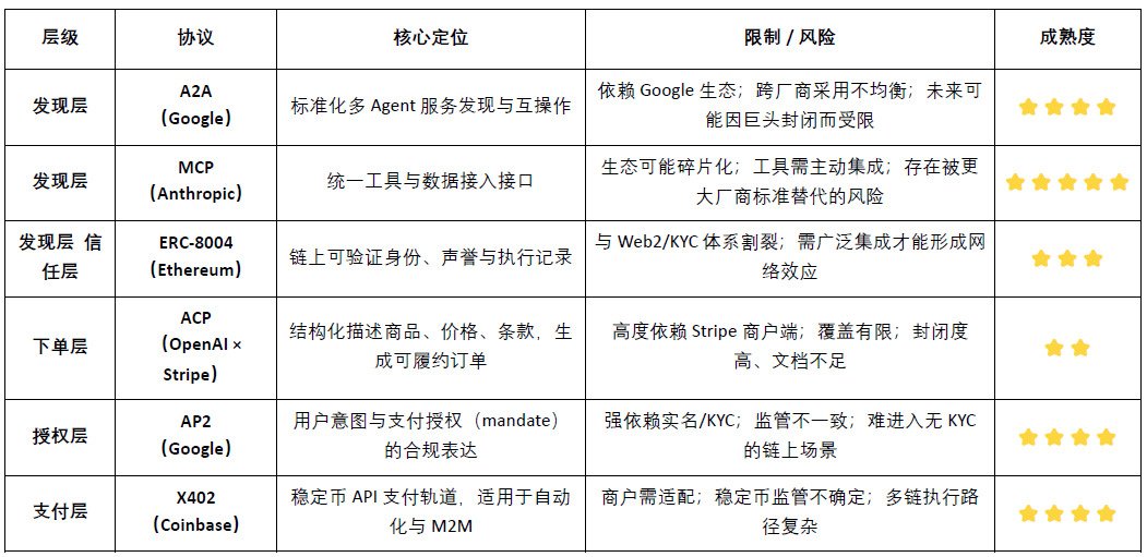 Basándose en la introducción de la pila de protocolos central de Agentic Commerce, la siguiente tabla resume el posicionamiento del protocolo, las capacidades principales, las principales limitaciones y la evaluación de madurez en cada nivel, proporcionando una perspectiva clara y estructurada para construir una economía de agentes multiplataforma, ejecutable y pagable.