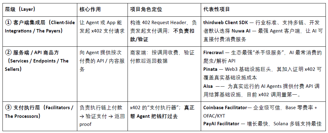 Capa de Ejecución de Pagos (Facilitadores/Procesadores): Esta capa gestiona las deducciones, la verificación y la liquidación en cadena. Es el motor de ejecución principal de x402, y algunos proyectos representativos incluyen: