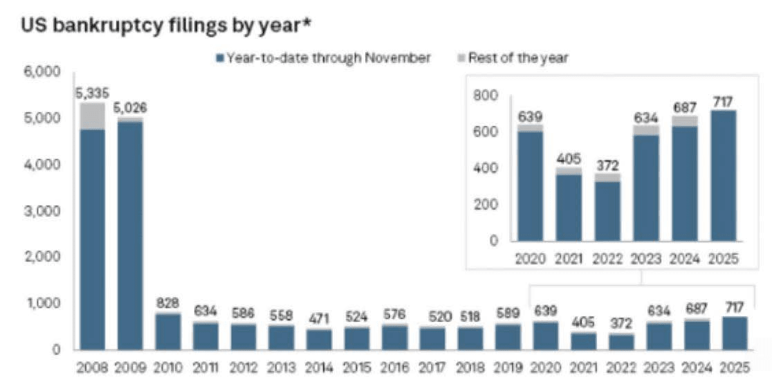 El estrés corporativo en los Estados Unidos se está intensificando. Hasta ahora en 2025, 717 grandes empresas estadounidenses se han declarado en quiebra, el conteo más alto en 15 años, ya por encima de cada total de año completo desde 2010.