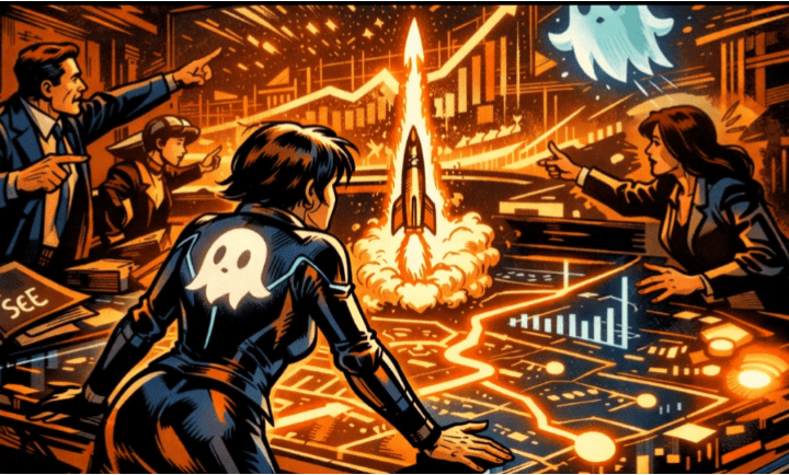 Sala de guerra futurista con un estratega de Aave lanzando un cohete sobre la hoja de ruta digital 2026.