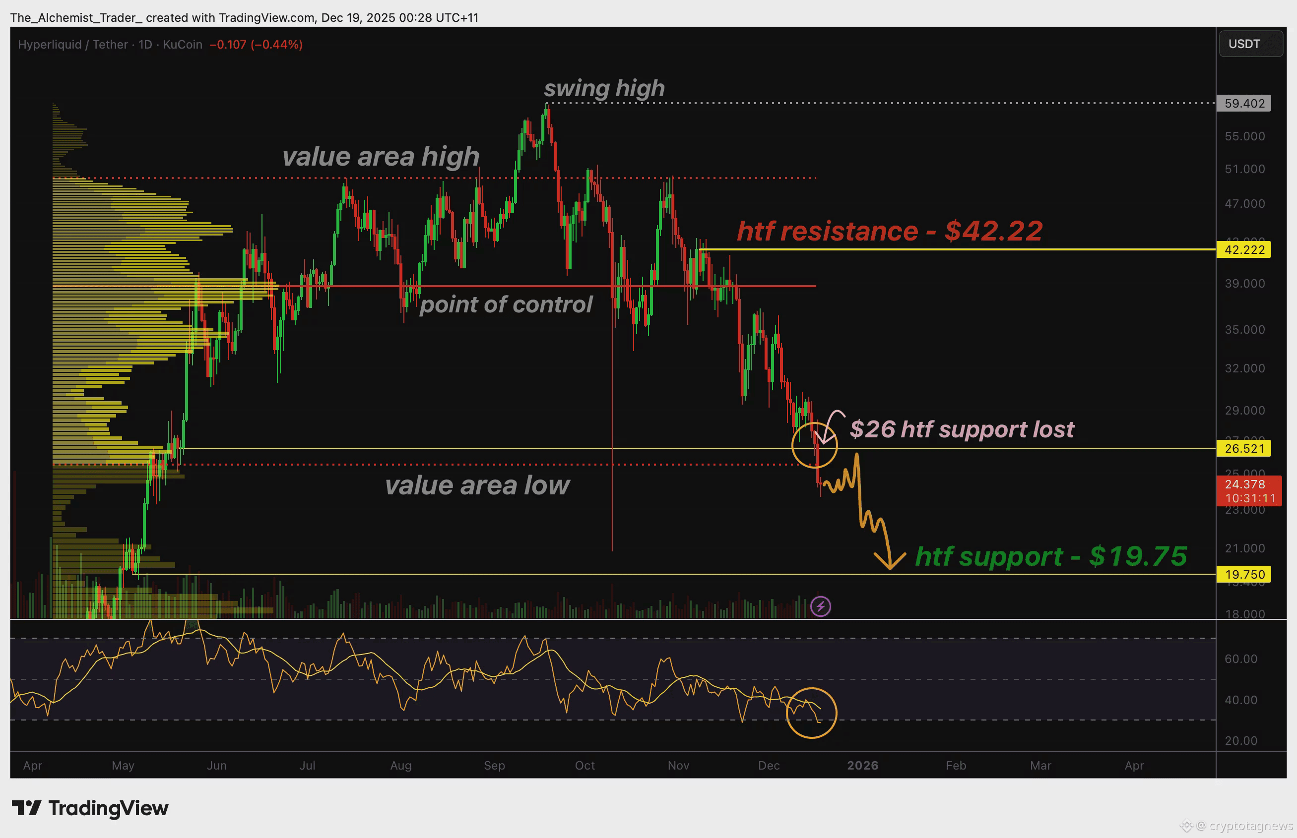 The recent loss of the $26 support level represents a significant technical breakdown for Hyperliquid. This zone previously acted as the final area of structural support capable of triggering a significant upward rotation. Once the price falls below this level, the probability of the uptrend continuing decreases significantly. The collapse has reinforced the prevailing downtrend, with Hyperliquid continuing to make lower highs and lower lows, a classic sign that sellers remain in full control.