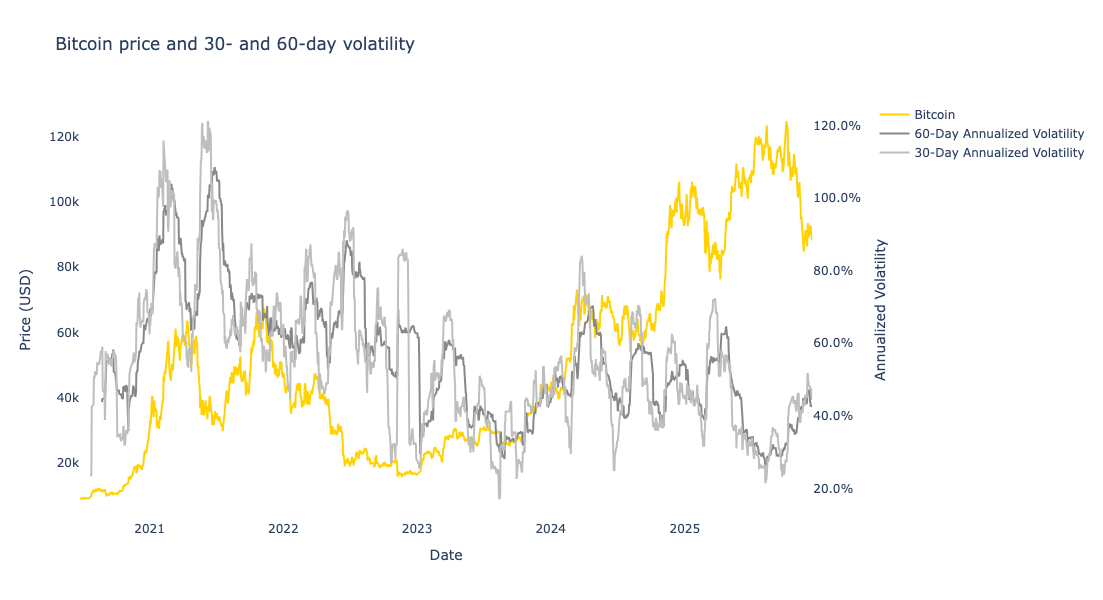 En 2025, la relación entre el precio de bitcoin y su volatilidad continuó pareciéndose más estrechamente a las acciones. La volatilidad y el precio se movieron inversamente, y la volatilidad se mantuvo muy baja durante los dos eventos de ATH de bitcoin en el verano. Un "sesgo de put" más pronunciado en los precios de las opciones sugiere que el comportamiento de las opciones de ETF y DAT está teniendo una mayor influencia. La era de los "meltups" de precio de bitcoin hacia arriba + volatilidad hacia arriba puede haber terminado.