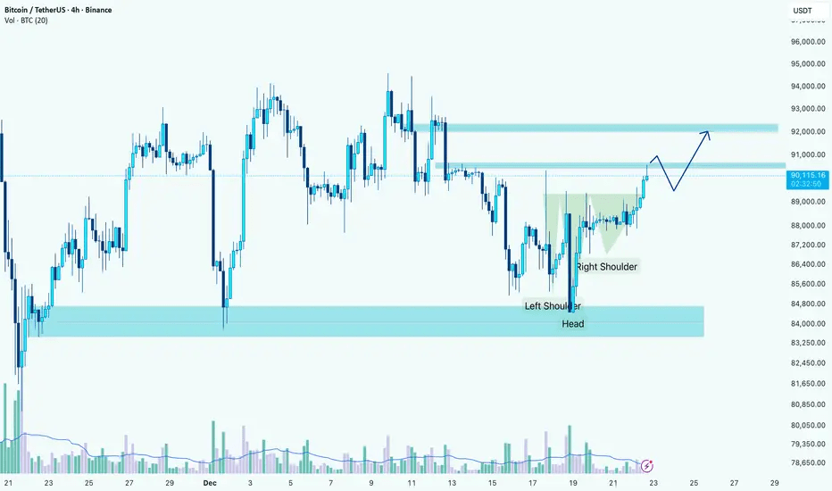 El precio se está acercando ahora al área del cuello cerca de 90,000–90,500, que se alinea con una zona de suministro a corto plazo. La aceptación por encima de este nivel confirmaría el patrón y abriría el camino hacia la zona de resistencia superior alrededor de 92,000.