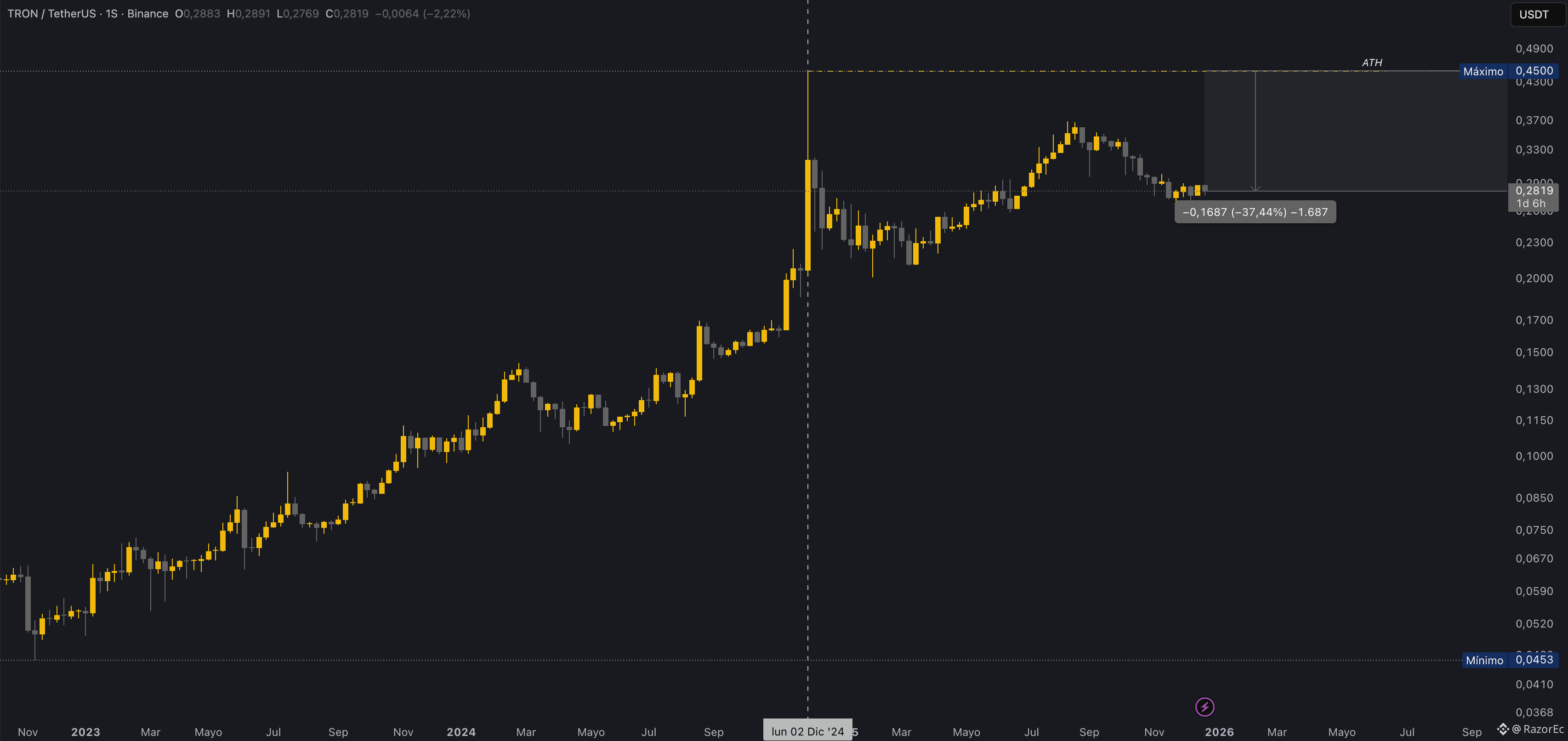Con una caída mucho más moderada desde sus niveles más altos frente a otros activos del grupo, TRX refleja que el mercado ya reconoce su utilidad operativa.