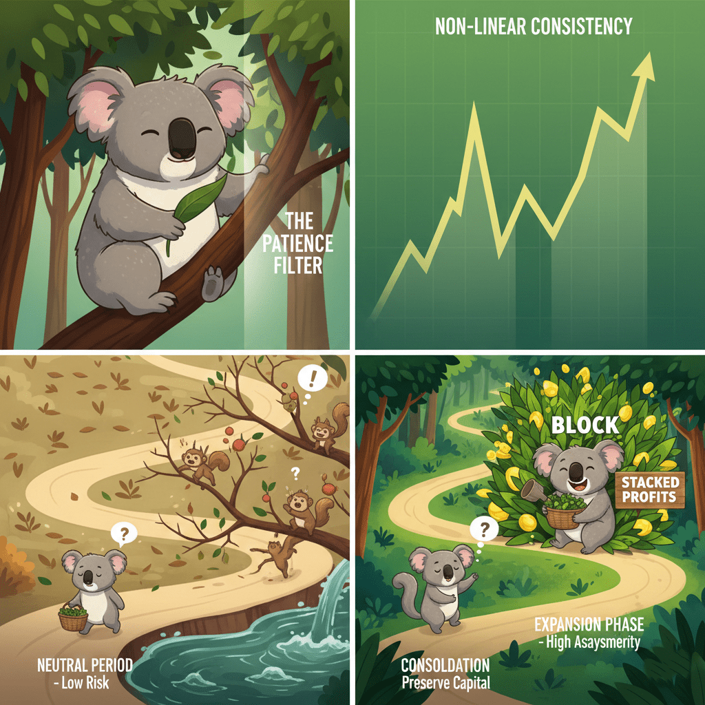 Deberes del Koala: Mira tu historial. Identifica los "bloques" donde hiciste dinero de verdad y los "valles" donde devolviste por ansiedad. ¿Vamos a aprender a quedarnos quietos en los valles? 🐨🧘♂️