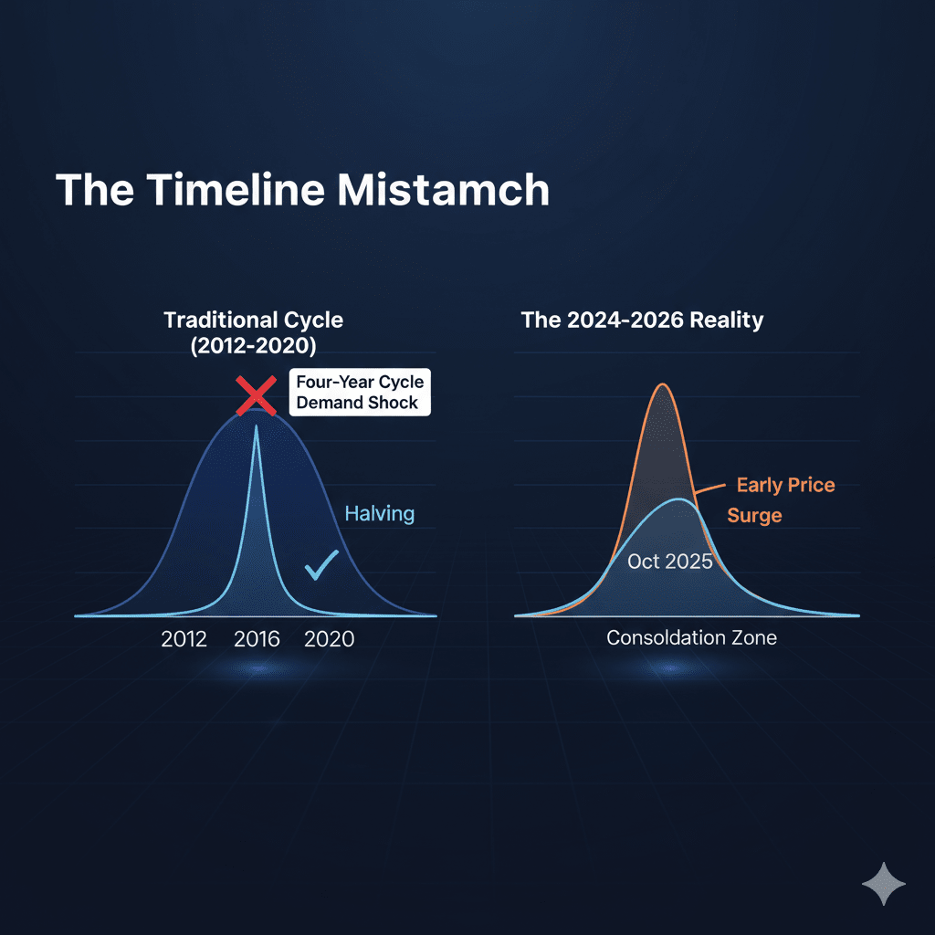 Avancemos a finales de 2025. La teoría del ciclo predijo un "pico explosivo" en diciembre de 2025. En cambio, alcanzamos nuestro punto máximo a principios de octubre y hemos estado sangrando lentamente desde entonces.