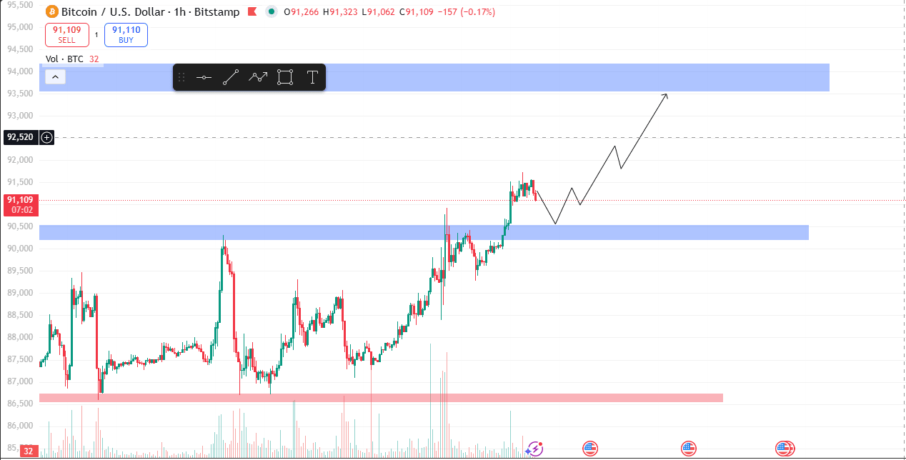 BTC tiene una zona de ruptura alrededor de 90,231–90,523, que ahora actúa como soporte. Velas alcistas fuertes con volumen en aumento sugieren que los compradores están en control. Podemos ver otra prueba pronto. La próxima zona de resistencia importante está marcada cerca de 93,500–94,200. Si BTC desciende de 90,000, entonces podemos ver otra caída. Así que tenga cuidado y use SL.