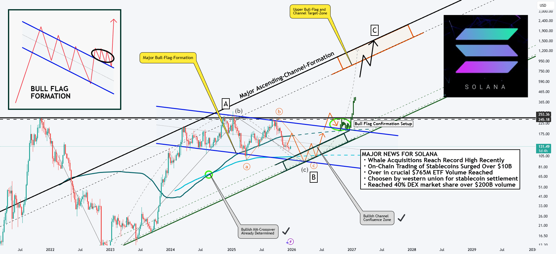 Desde una perspectiva técnica, Solana sigue firmemente dentro de una tendencia macro ascendente más amplia en el gráfico semanal. La estructura más significativa actualmente en juego es una formación de bandera alcista a gran escala, que ahora se acerca a su etapa de desarrollo media a tardía.
