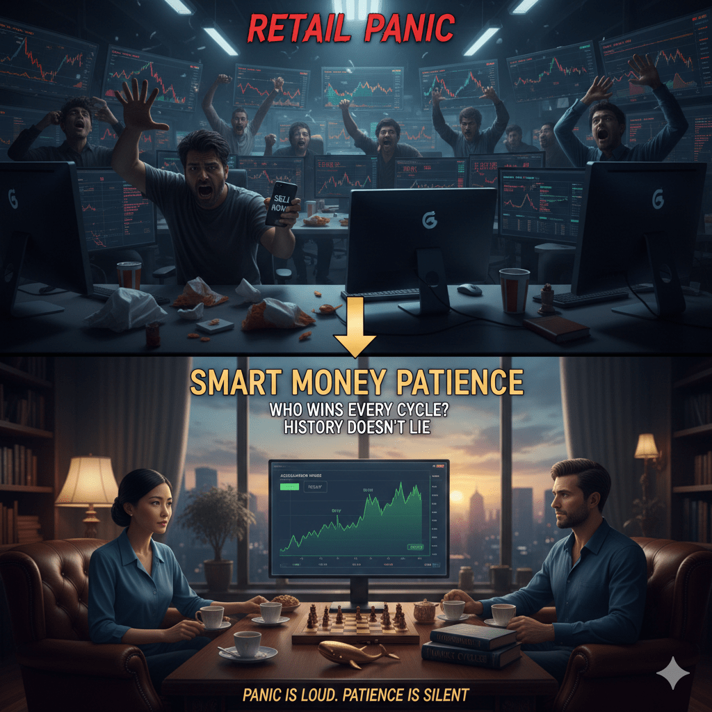 ¿Inversores institucionales, ballenas y traders astutos? Ven el caos como una oportunidad. La paciencia es su arma. Compran cuando otros venden, mantienen cuando otros salen y dejan que el interés compuesto haga su magia.