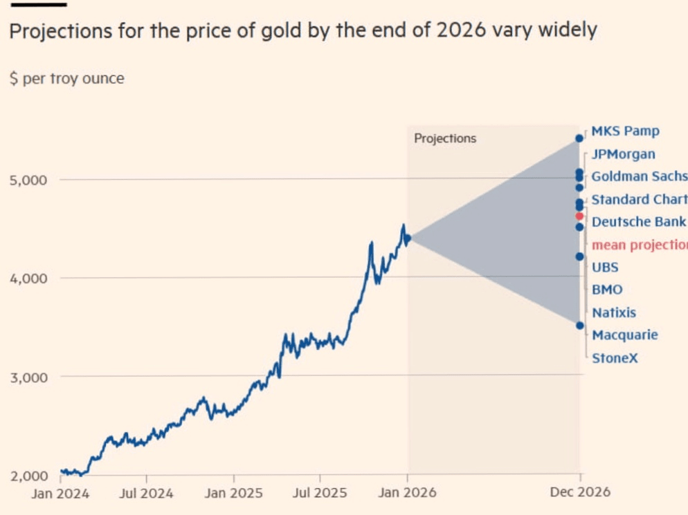 Se proyecta que el oro continuará su aumento récord a lo largo de 2026. Según una encuesta del Financial Times, los expertos anticipan un aumento del 7%, llevando los precios a aproximadamente $4,610 por onza para el cierre del año.