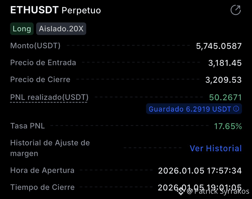 Hoy, con la cabeza más clara, volví a mirar el precio. Sin prisas, sin necesidad de entrar. Esperé a que el mercado volviera a ofrecer una entrada que tuviera sentido. Y cuando llegó, ejecuté este trade en $ETH .