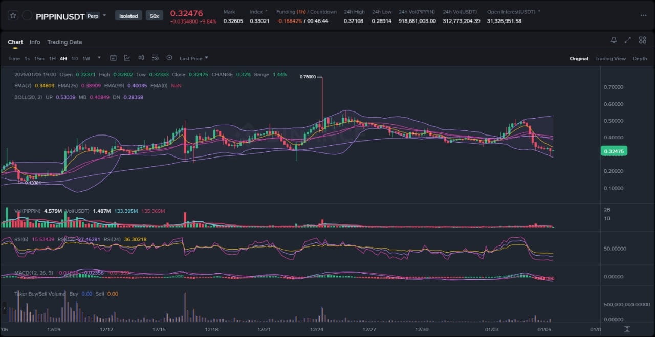 El primer tema es el repunte del sector de las monedas meme, destacado en el artículo de BeInCrypto del 4 de enero de 2026, que es inequívocamente alcista para PIPPIN. Detalla un aumento del 31% en el precio en 24 horas, atribuyéndolo a señales macroeconómicas mejoradas como un mayor interés de los inversores minoristas y una reducción de la presión de venta en las monedas meme. Esto se alinea sin problemas con el movimiento impulsivo del gráfico, sugiriendo que flujos de liquidez externos están impulsando la ruptura en lugar de una simple euforia aislada.