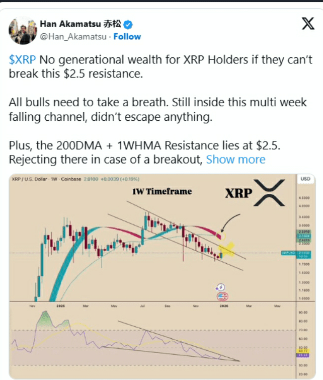 Antes de que XRP pueda desafiar seriamente $2.50, Akamatsu cree que primero debe establecer aceptación por encima de la línea de tendencia superior del canal, que actualmente se sitúa en el rango bajo de $2. Fallar en hacerlo sugeriría que las ganancias recientes son meros movimientos correctivos en lugar del inicio de una tendencia alcista sostenida.