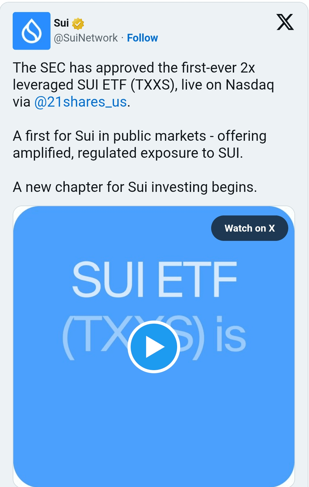 El TXXS aprobado por la SEC introduce el primer ETF de Sui con apalancamiento, ofreciendo una exposición de 2x diaria a SUI.