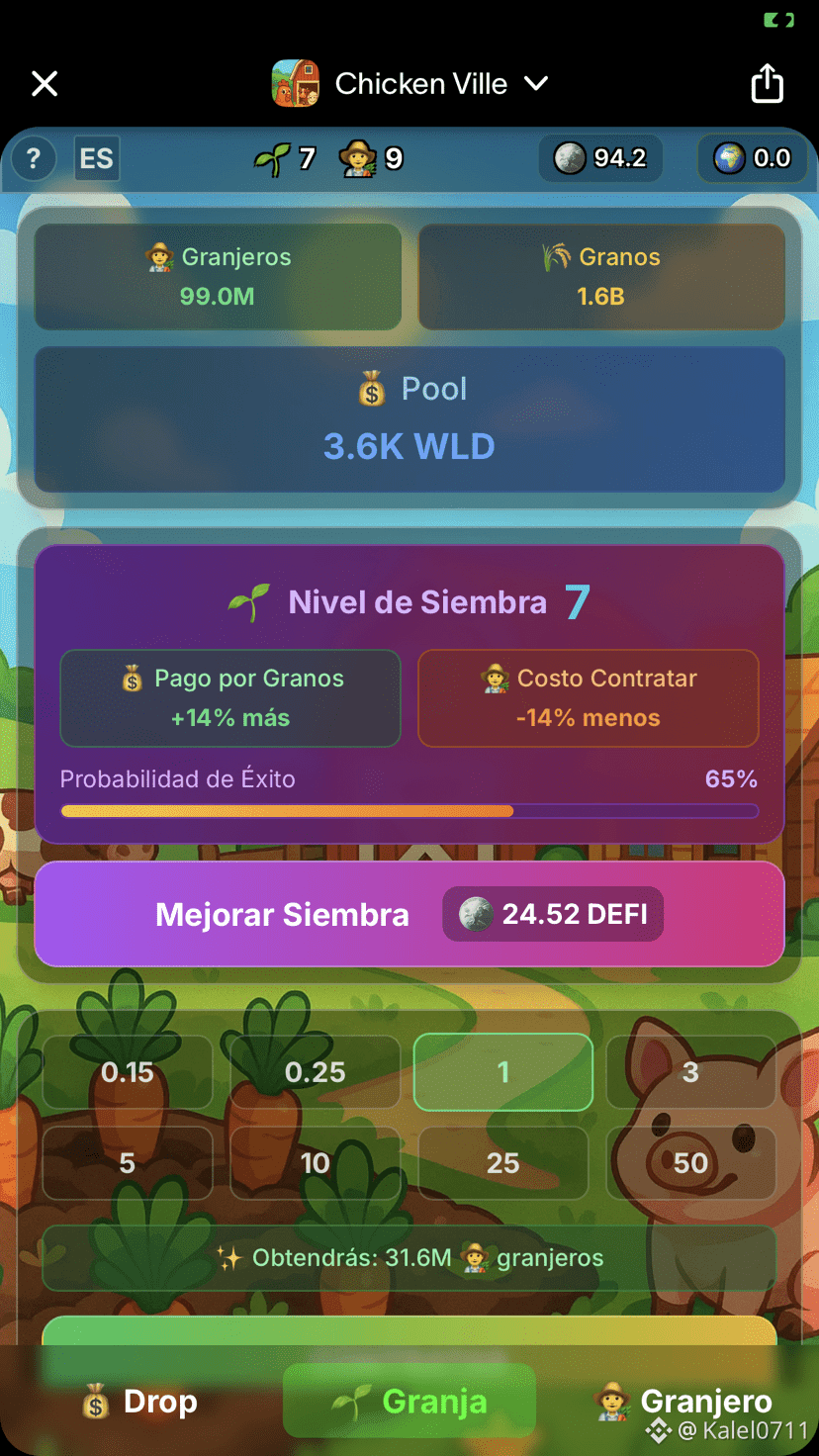 Esta mini-app de World App se llama Chicken Ville. Es un juego de simulación económica de tipo "idle" (progresivo) donde el objetivo principal es gestionar una granja para obtener recompensas, probablemente vinculadas al ecosistema de Worldcoin (WLD).