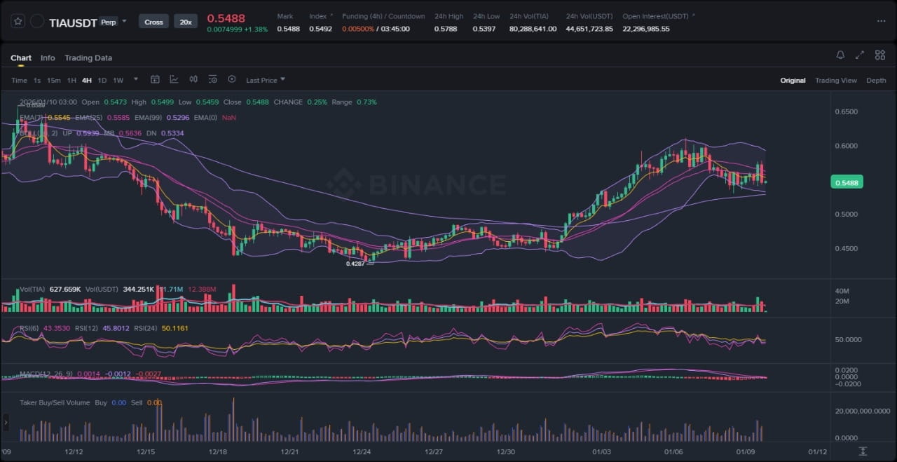 Los puntos prácticos incluyen monitorear el comportamiento del volumen para picos por encima de 1.5 veces el promedio (actualmente 250 millones de TIA diarios) en el soporte de $4.52, ya que una compra sostenida podría señalar acumulación institucional; observar la reacción en la banda media de Bollinger $5.05, donde un cierre limpio por encima podría insinuar una reversión a la media; y rastrear el momentum a través de la divergencia del RSI—si el precio hace nuevos mínimos pero el RSI se mantiene por encima de 25, podría presagiar un aumento probabilístico. Además, observar barridos de liquidez en la zona de $4.40-$4.60, donde los grupos de stop-loss de posiciones apalancadas podrían alimentar la volatilidad.