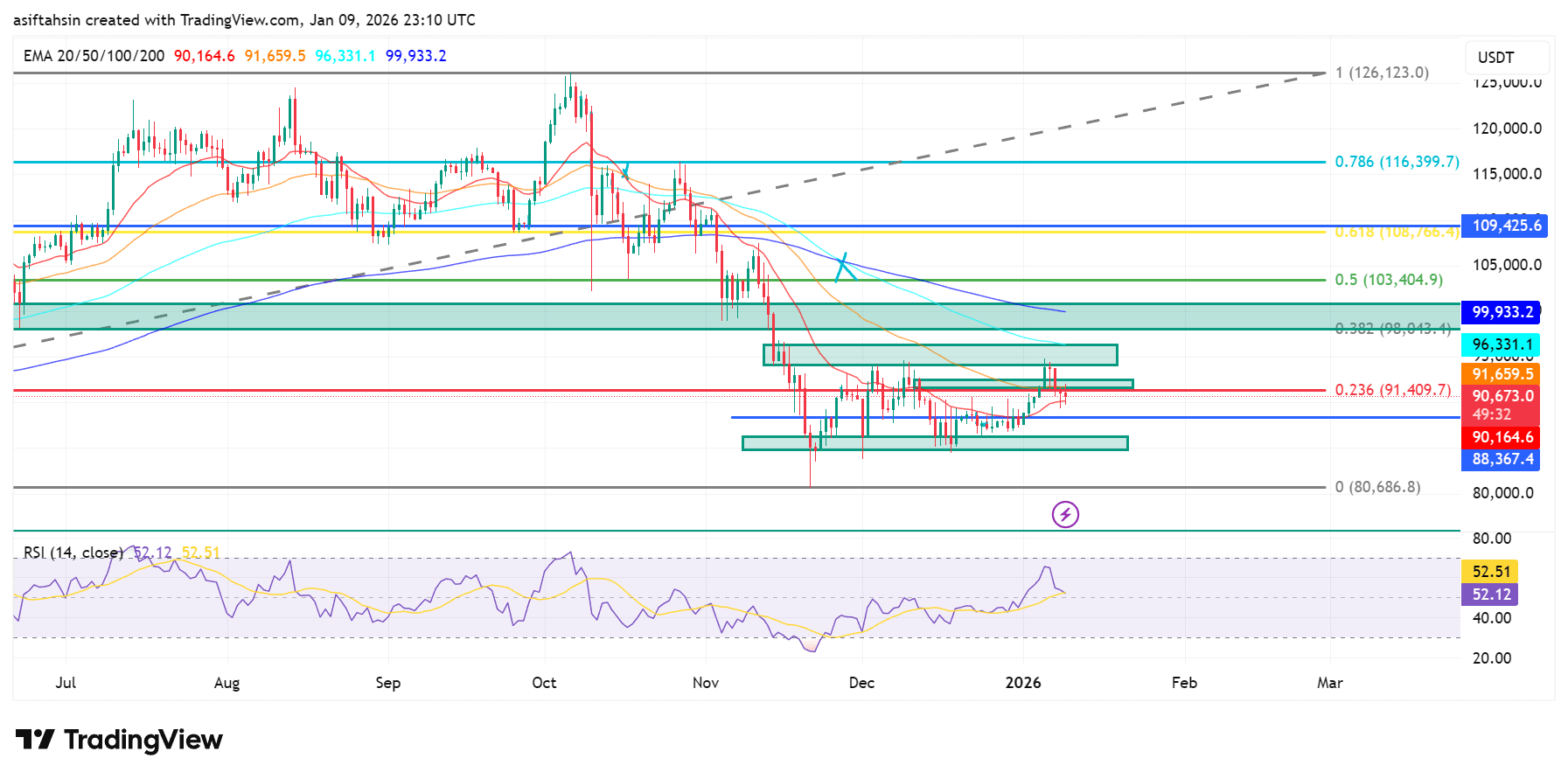 BTC se está consolidando por encima de la zona clave de demanda de $88.000–$90.000, donde los compradores defendieron con fuerza en el pasado. La acción reciente del precio muestra mínimos más altos, lo que sugiere una fase de construcción de base y una probabilidad creciente de una recuperación a corto plazo.