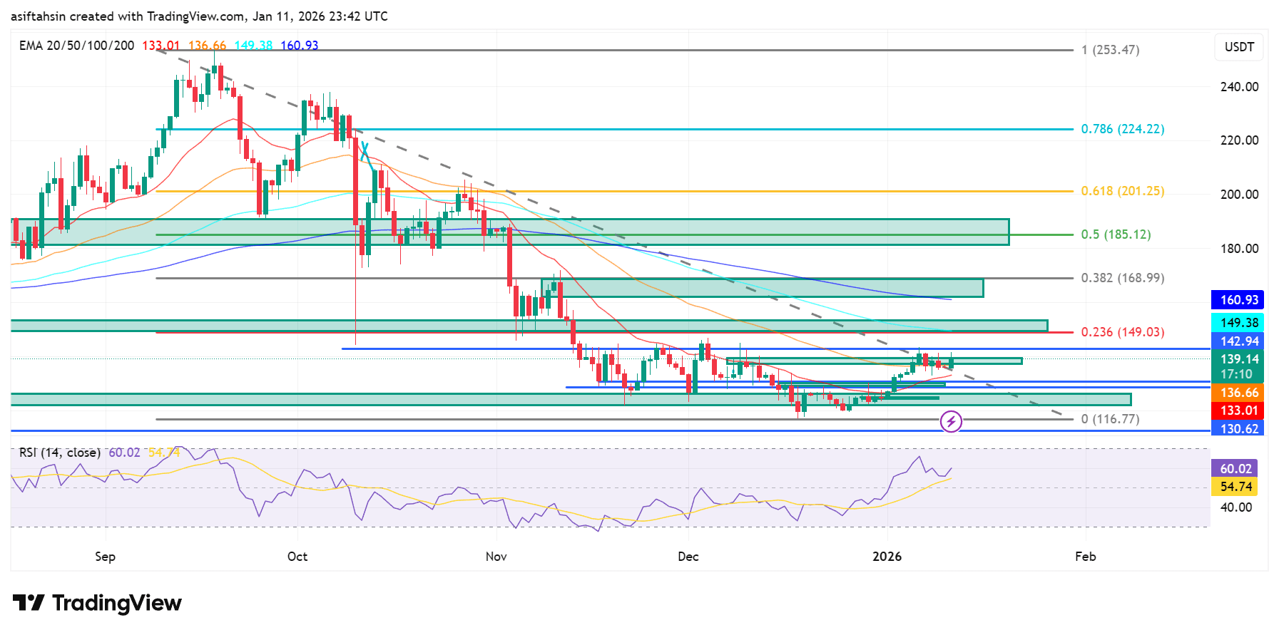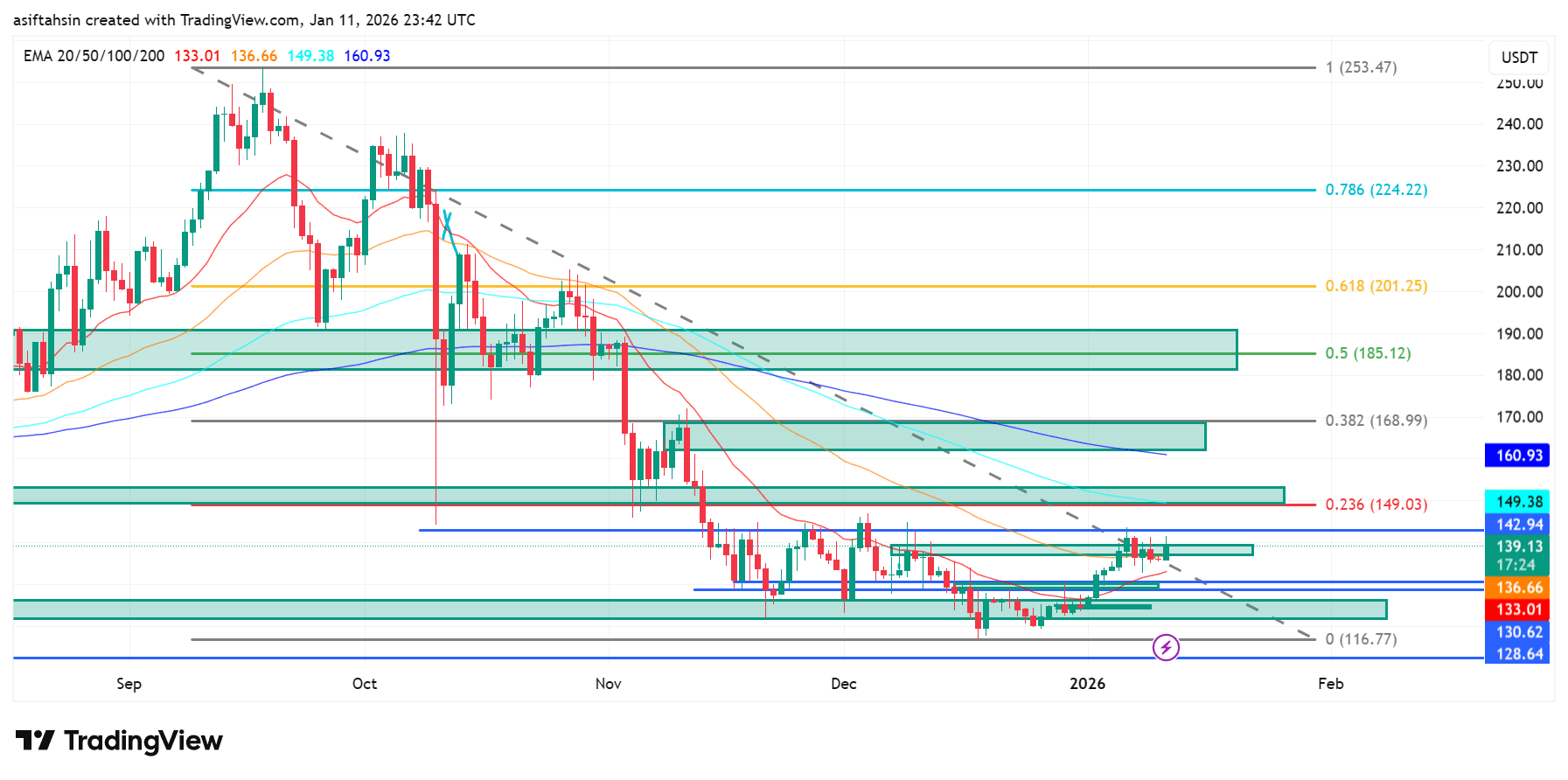 Un movimiento sostenido por encima de $149 (Fib 0.236) abriría camino hacia $168–$185, donde se encuentra una fuerte resistencia de confluencia de Fibonacci y EMA. Una recuperación estructural significativa requeriría una aceptación por encima de $185 (Fib 0.5).