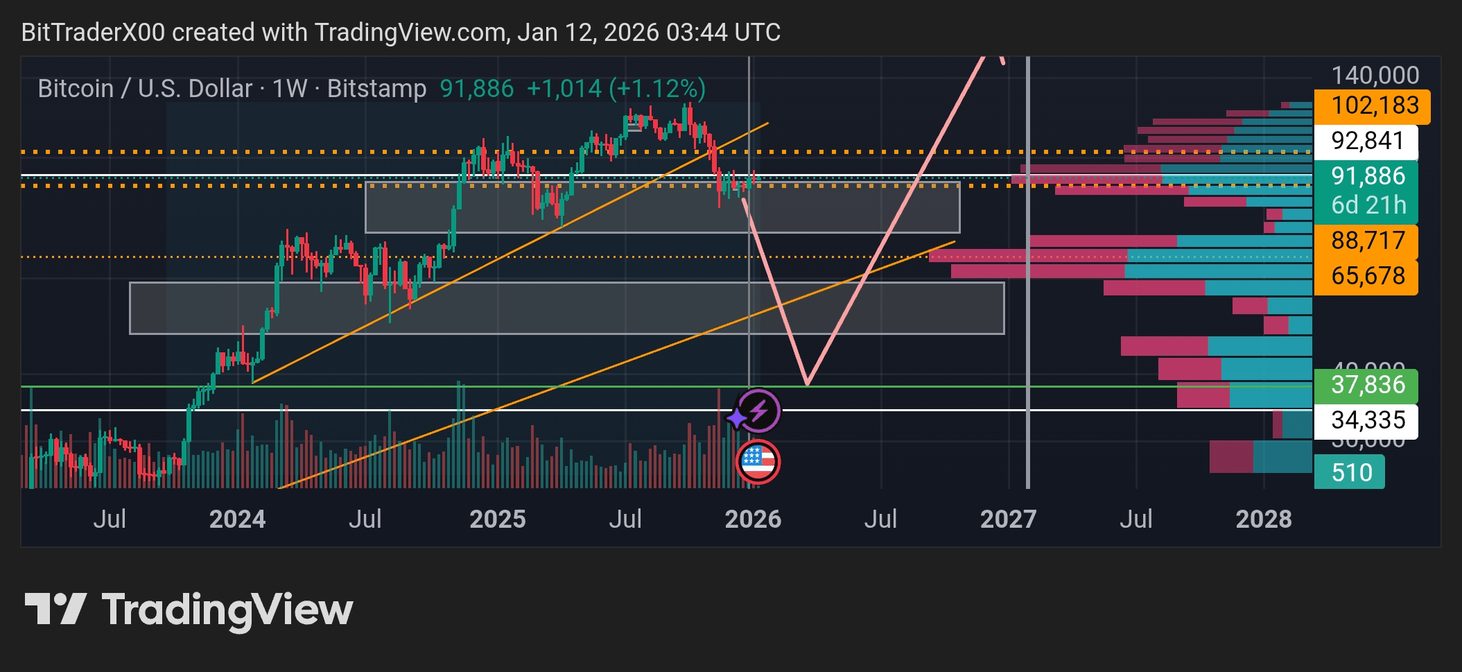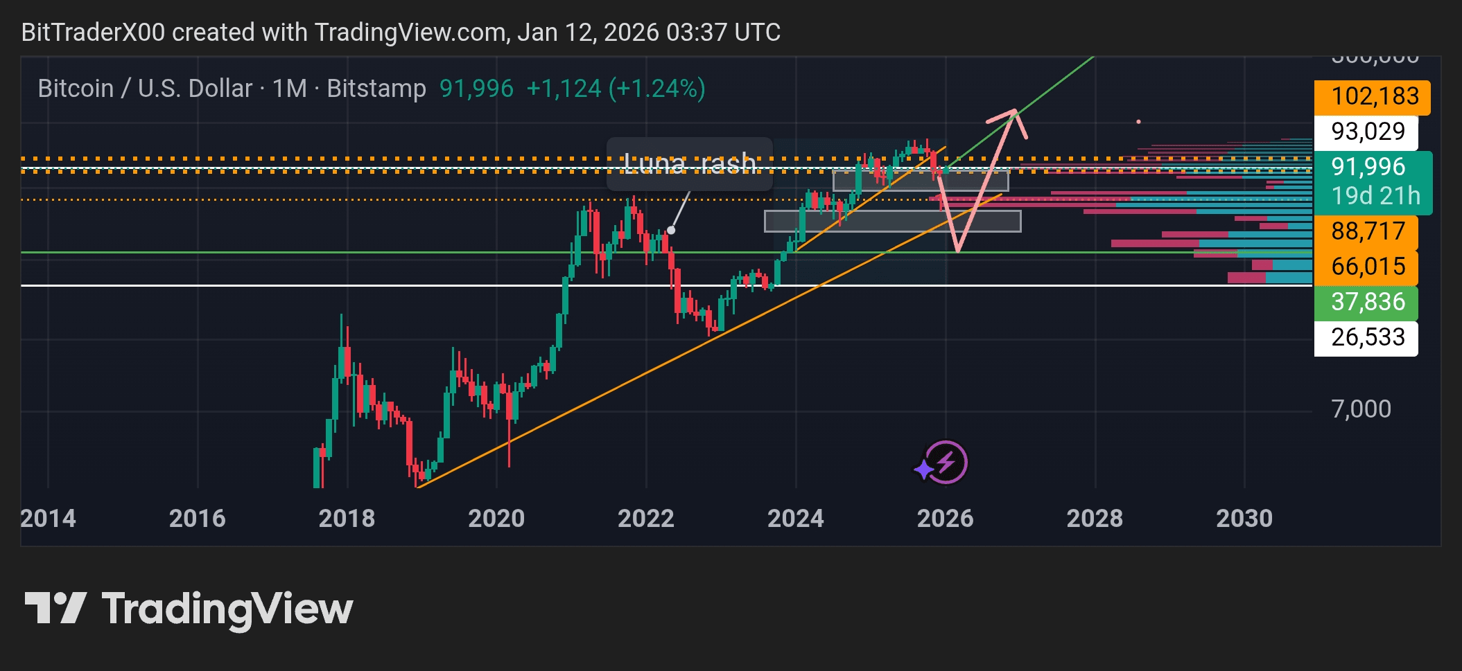Este es mi análisis a medio plazo. Espero una subida desde aquí hasta los 102.000$. Es muy probable que el mercado caiga desde ese precio. Pero recuerda que siempre soy alcista. Porque el soporte de la tendencia no está en el nivel de 88.000$ ni en el de 102.000$. Está por encima del nivel de 36.000$. Si el precio del Bitcoin está por encima de 36.000$, es alcista.