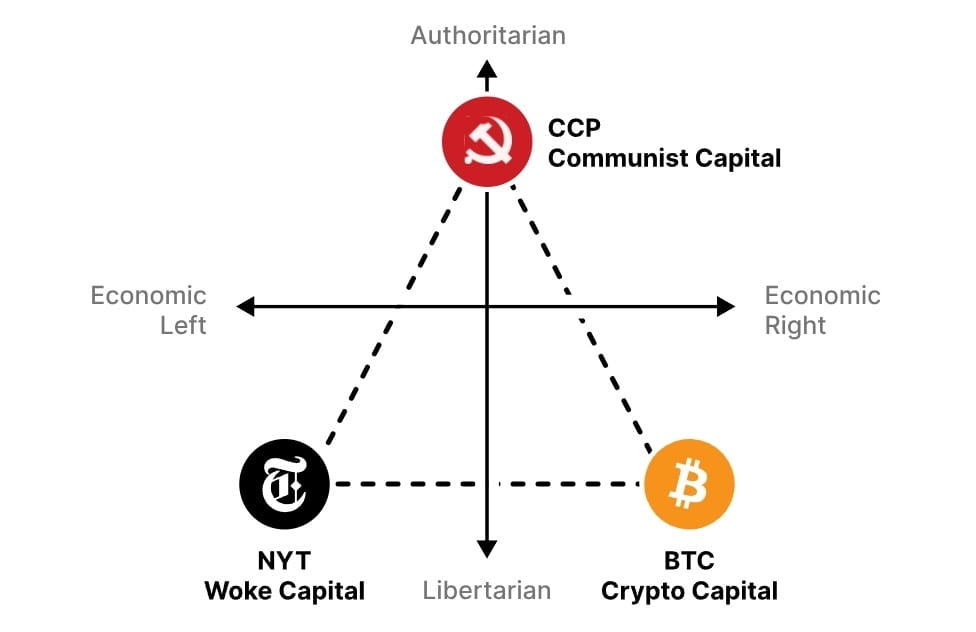 También habló sobre cómo el mundo se enfrenta a un "Momento Tripolar", donde tres potencias y visiones principales compiten por ganar más influencia: el establishment estadounidense (simbolizado por el periódico NYT), el Partido Comunista de China (PCCh) y la Internet Global (simbolizada por BTC). El primero se describe como "capitalismo que permite la censura descentralizada", el segundo sería un capitalismo completamente centralizado y el último es el capitalismo sin Estado, el sector descentralizado y neutral.