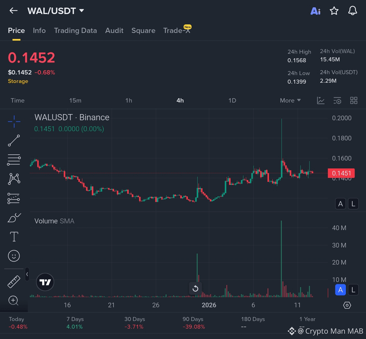 24h Volume: Impressive 15.45M WAL (~$2.2M+ in USD equivalent), signaling renewed interest