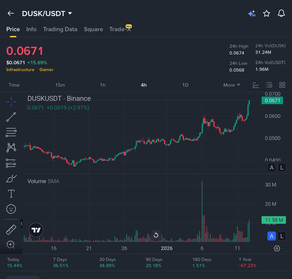 $DUSK está mostrando una fuerza seria en este momento. Hasta hoy (12 de enero de 2026), el token se está negociando en torno a $0.0671 en Binance (DUSK/USDT), lo que representa un sólido aumento del +15.69% en las últimas 24 horas.
