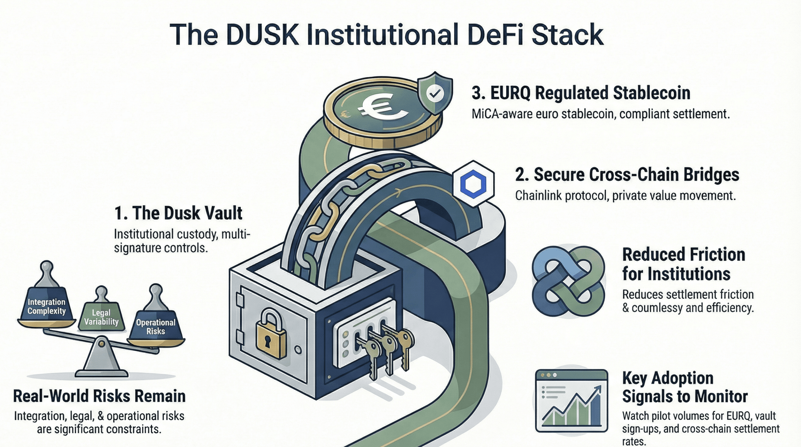 Veo @Dusk pasar de los primitivos de privacidad a primitivos DeFi prácticos que las instituciones puedan utilizar. La combinación es sencilla: una bóveda de calidad de custodia para tenedores institucionales, mensajería segura entre cadenas para mover tokens entre redes y rutas de stablecoins reguladas como EURQ para liquidar valor sin exponer detalles sensibles. Juntos forman una pila usable donde los euros tokenizados, la liquidación privada y la utilidad entre cadenas coexisten. Eso es diferente de un enfoque puramente sin permisos; está diseñado para compatibilidad con flujos regulados y requisitos de custodia institucional.