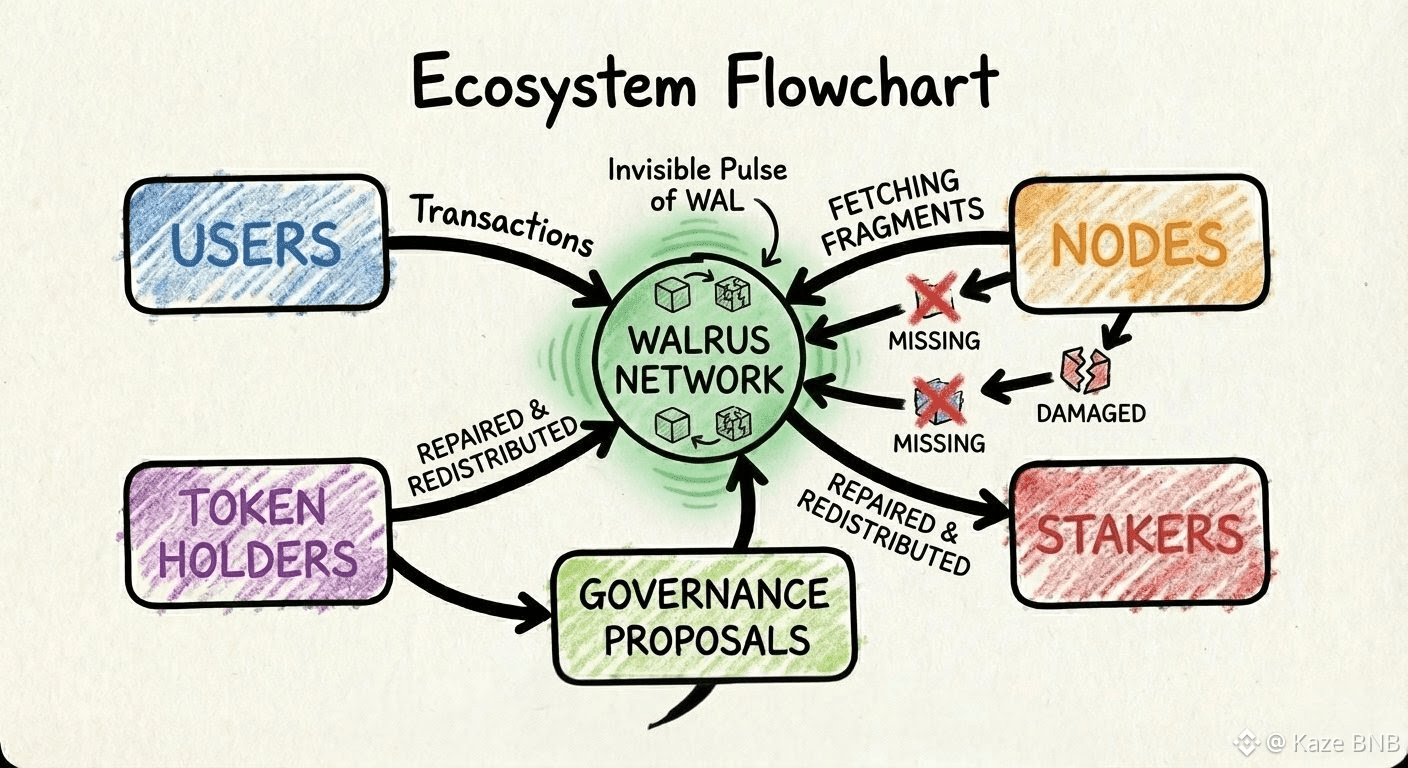 By the time my file completed its journey, I understood the subtle truth about Walrus: it wasn’t a storage service, it was an ecosystem. Fragments moved like a living community, nodes acted like responsible citizens, and WAL wasn’t a reward, it was the pulse that ensured continuity, accountability, and reliability under pressure. Observing the system changed my perspective: I realized that trust doesn’t need visibility, that responsibility can exist without supervision, and that even when no one is watching, the network maintains itself.