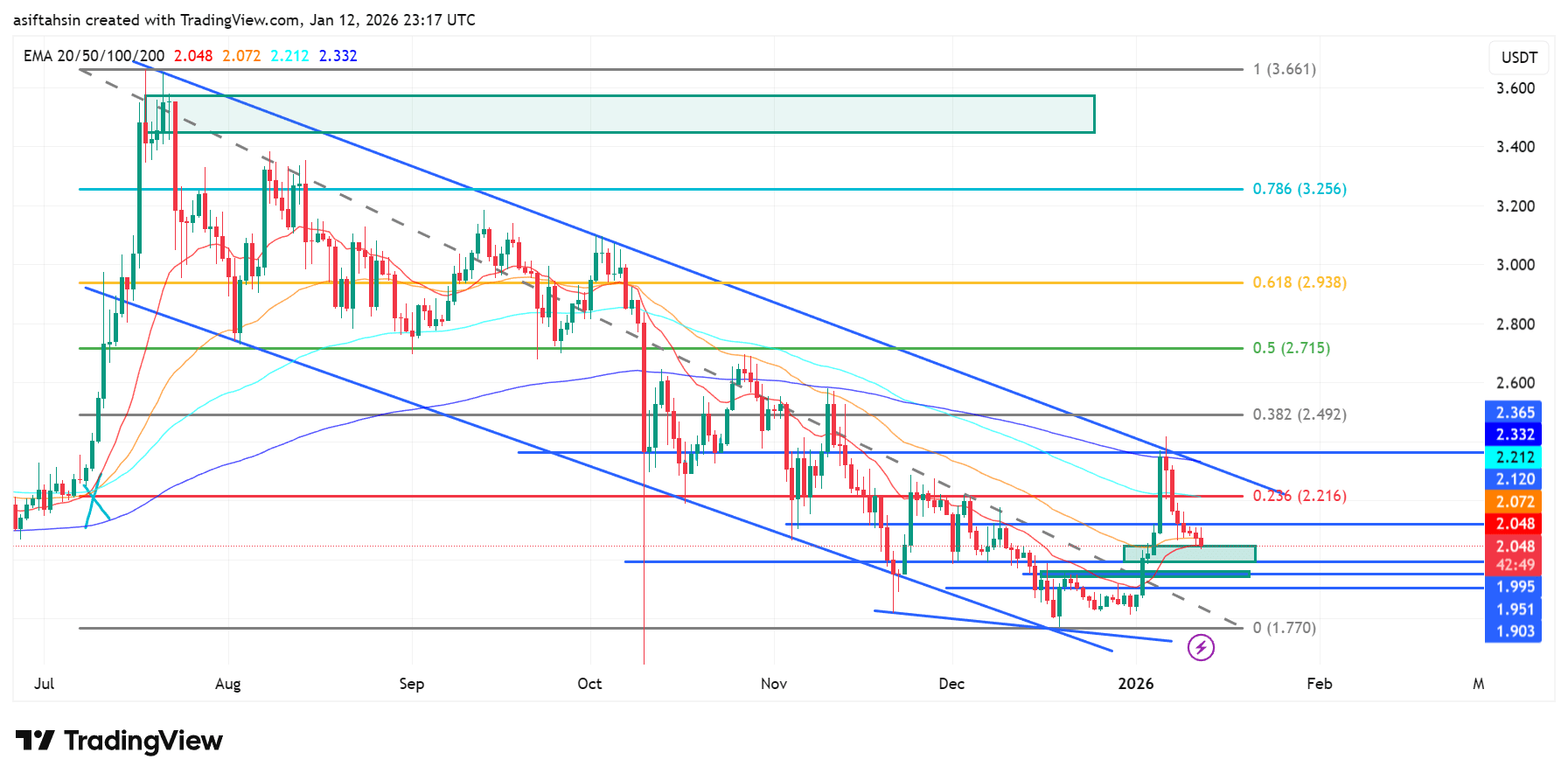 XRP no logró mantenerse por encima del grupo de Fib 0.382–0.5, confirmando la continuación de la estructura correctiva. La acción actual del precio se mantiene por encima de la zona de soporte de $1.95–$2.00, que coincide con acumulación previa y el límite inferior del canal descendente.