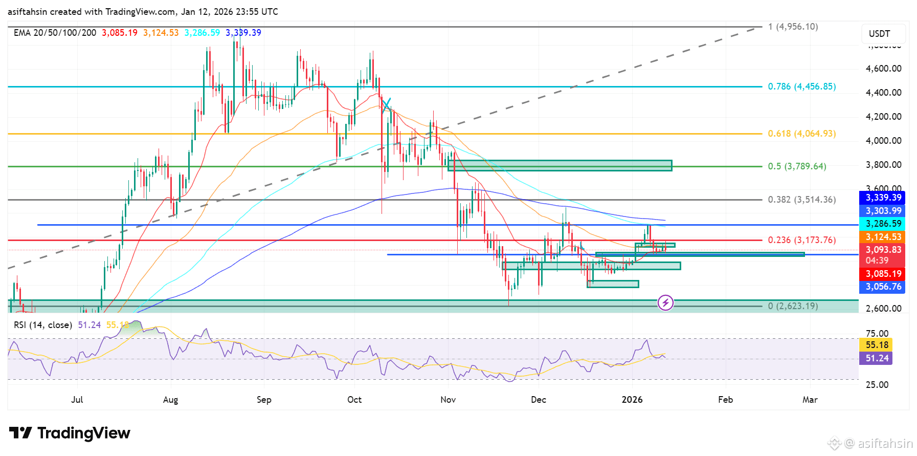 Ethereum is consolidating after an extended corrective decline, holding above a critical demand zone near $3,000. While downside momentum has slowed and RSI continues to recover, the broader structure remains bearish below $3,300–$3,350.
