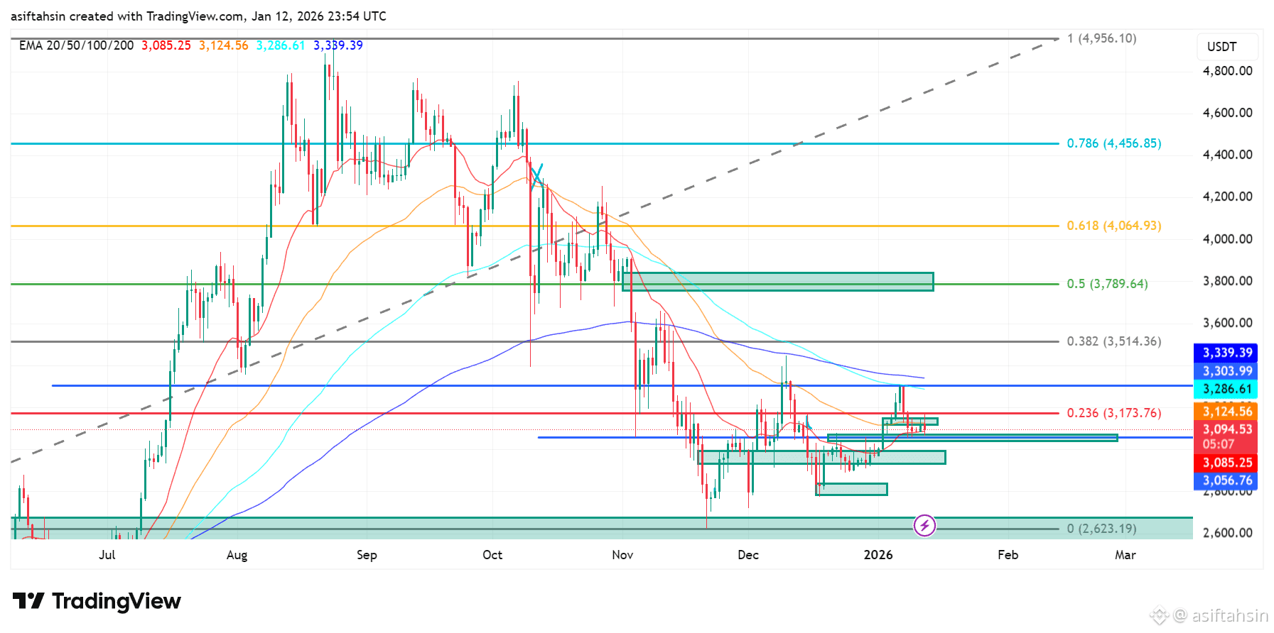 Ethereum continues to trade within a corrective consolidation after failing to sustain above the $3,780–$4,060 supply zone (0.5–0.618 Fibonacci). The rejection from this region and subsequent breakdown below the rising trend structure shifted ETH into a neutral-to-bearish medium-term bias.