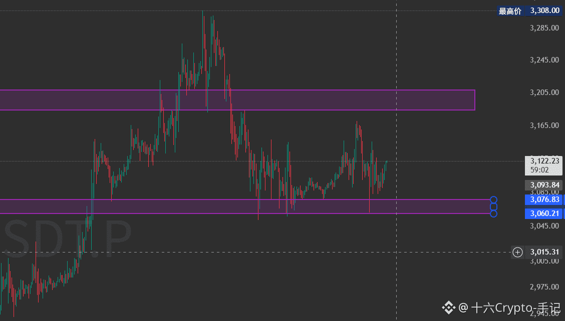 切换至 4 小时级别,布林带处于收口状态,上轨压力位在 3141,目前该位置已被突破。K 线呈现十字星形态,整体处于多头趋势中。MACD 双线即将向上穿越零轴,不过当前多头力量依旧疲软;KDJ 处于低位,即将形成金叉;RSI 数值为 49,从底部拐头上探,预示短期内存在一波小型多头动能。