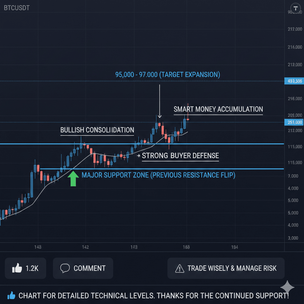 Bitcoin (BTCUSDT) actualmente se está negociando dentro de una fase de consolidación alcista, reflejando una fuerza subyacente fuerte en el mercado. La acción del precio permanece controlada y constructiva, con los compradores defendiendo firmemente los niveles clave y evitando cualquier movimiento a la baja significativo.