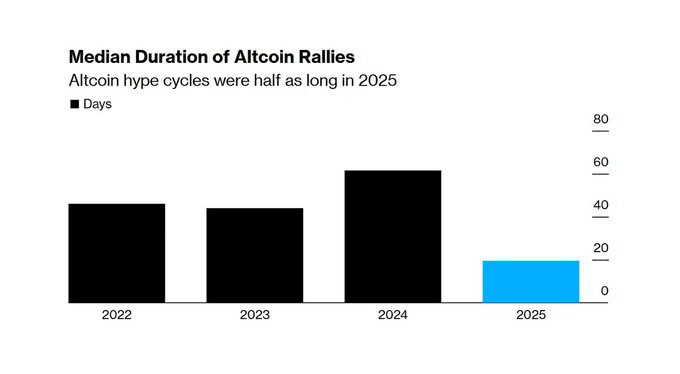Según datos de Wintermute, la duración media de las alts-rallies en 2025 es de unos 20 días.