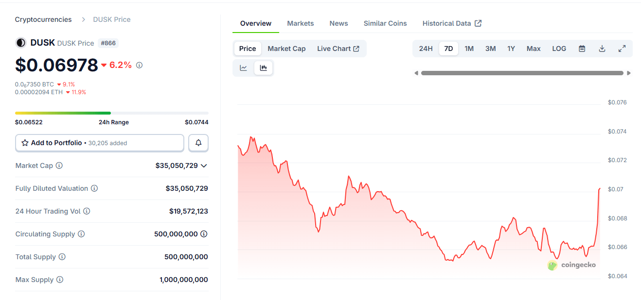 A partir del 14 de enero de 2026 $DUSK el trading ronda los 0,070 dólares con un aumento del 20 % en 24 horas. El volumen superior a 19 millones muestra atención. Pero lo que importa más es por qué. El token impulsa el gas, staking, gobernanza, seguridad y mecanismo de quema. Una alta tasa de APY en staking y bloqueo de oferta. La capitalización de mercado totalmente diluida ronda los 34 millones de dólares, lo cual es pequeño comparado con la ambición. Esta es la asimetría que los traders buscan, pero sin utilidad real, significa nada. Aquí sí existe utilidad.