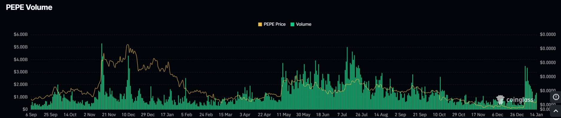 El precio de PEPE subió otro 14% el miércoles, manteniendo un fuerte soporte por encima de los $0.000006630 USD, continuando su reciente impulso al alza. Este movimiento está respaldado por un aumento notable en la actividad: