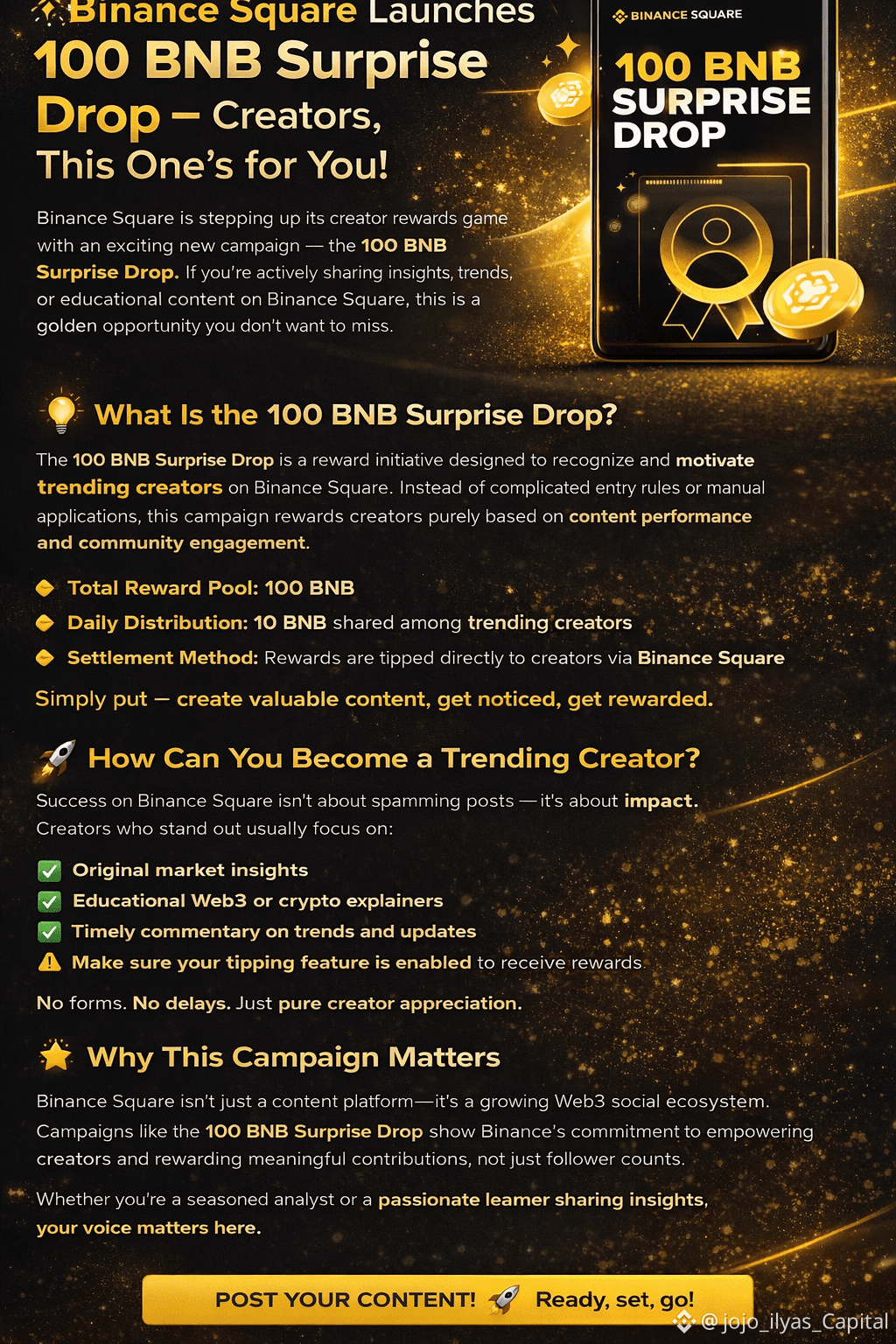 The 100 BNB Surprise Drop is a reward initiative designed to recognize and motivate trending creators on Binance Square. Instead of complicated entry rules or manual applications, this campaign rewards creators purely based on content performance and community engagement.