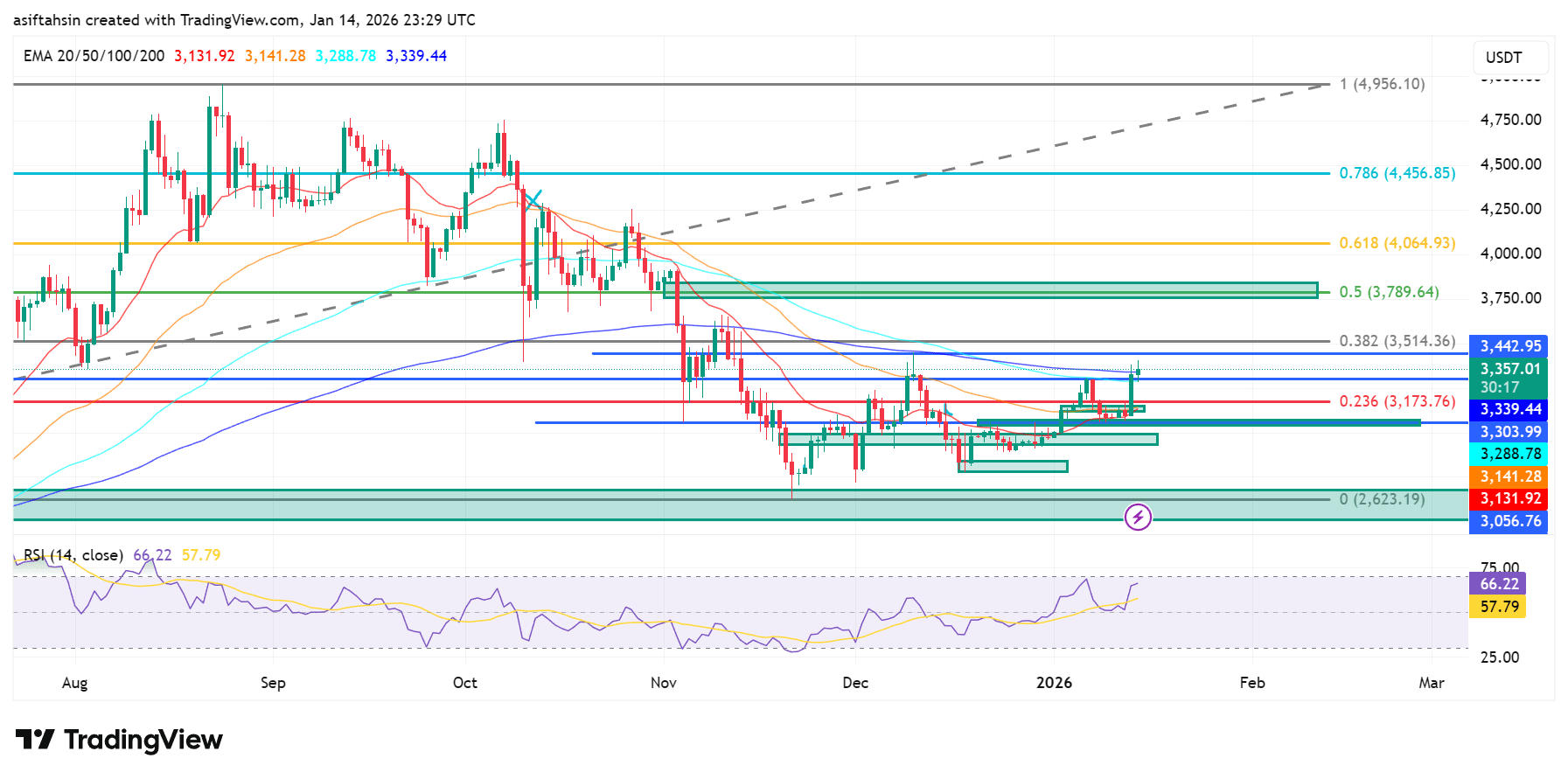 ETH se encuentra actualmente consolidándose alrededor del nivel de Fib 0.236 ($3,174), actuando como una zona clave de giro. Una aceptación sostenida por encima de este nivel podría permitir que el precio pruebe $3,514–$3,790, donde se alinean la resistencia de Fibonacci y la confluencia de EMA.