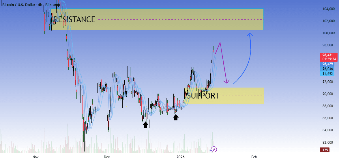 El precio avanzó impulsivamente hasta ~96–97k (fuerte impulso alcista).
